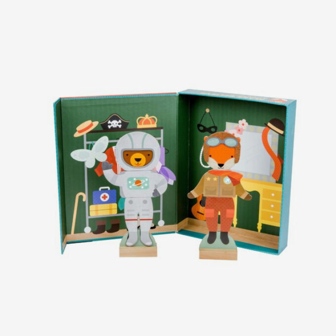Set från Petit Collage med fantasifullt kostymtema i magnetförsluten låda. Innehåller 2 magnetdockor, 2 trästativ, 35 magnetiska delar och en illustrerad scen.